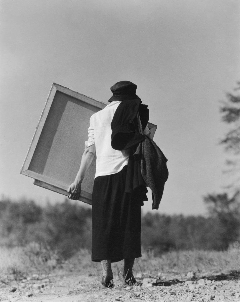 Foto: La artista Georiga O’Keeffe en su rancho de Nuevo México, acarreando su cuadro, yendo a pintar la montaña desde la montaña.